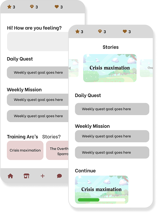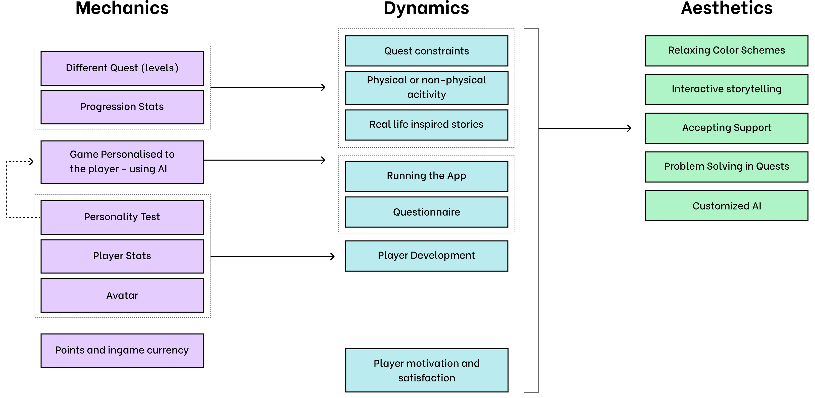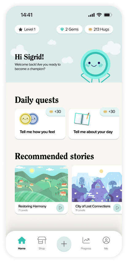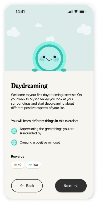 Brukeren får daglige oppgaver som oppmuntrer til refleksjon, vanebygging og mental egenomsorg. Én av oppgavene inkluderer å registrere dagens følelser og tanker. Fullførte quests belønnes med in-game valuta, badges og avatar-tilpasning, som øker engasjement og eierskap over prosessen. Brukeren kan også følge sin emosjonelle utvikling over tid gjennom visuelle oversikter.