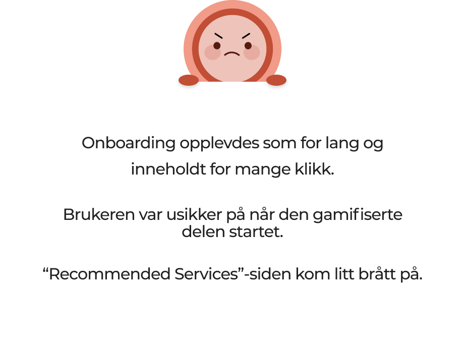 Kun én testperson ble brukt, så vi kan ikke vite om løsningen faktisk fungerer for målgruppen. Flere tester ville gitt innsikt i svakheter som f.eks. en for lang onboarding.