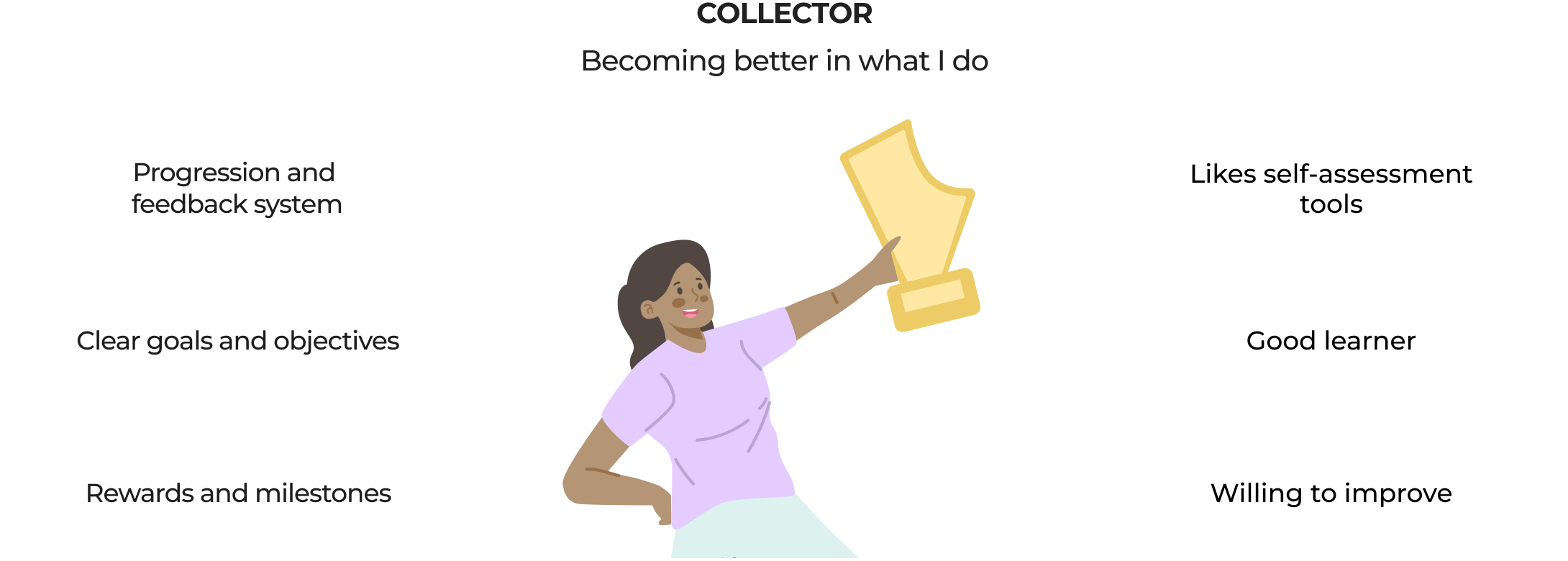 For å forstå hvilken type spillere appen skulle engasjere, tok vi utgangspunkt i Richard Bartles modell over spillertyper, samt videreutviklingen til gamification-spesialist Dominique Mangiatordi (6;7). Vi valgte å fokusere påCollector-typen, som kjennetegnes ved ønske om selvutvikling og motivasjon gjennom tydelige mål og progresjon.
