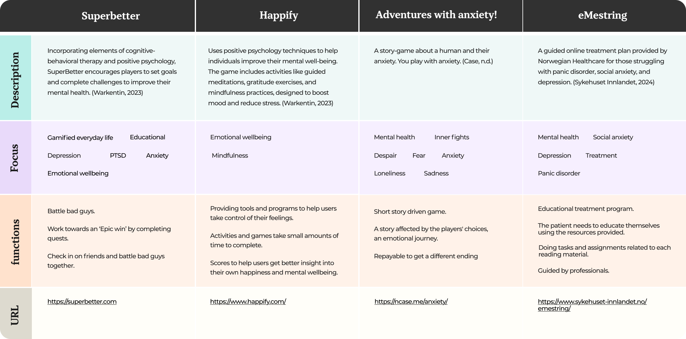 Vi analyserte eksisterende apper og spill for psykisk helse for å se hva som fungerer. Ikke alle er serious games, men brukerne opplever dem som nyttige for sin mentale helse.