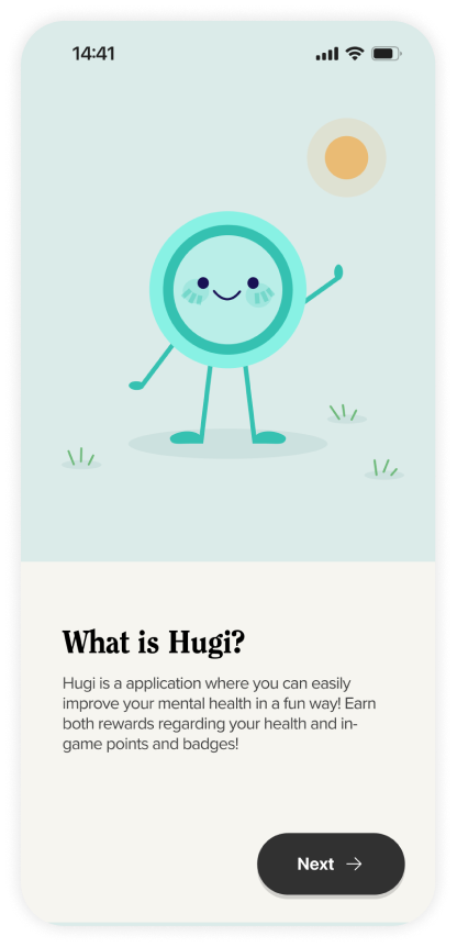Når brukeren åpner appen, blir de introdusert for HUGI, en AI-basert veileder som følger dem gjennom reisen. Deretter logger de inn med sikre norske bankløsninger før de tar en kort personlighetstest. Resultatet brukes til å skreddersy opplevelsen, og gir samtidig brukeren innsikt i egne personlighetstrekk på profilen.